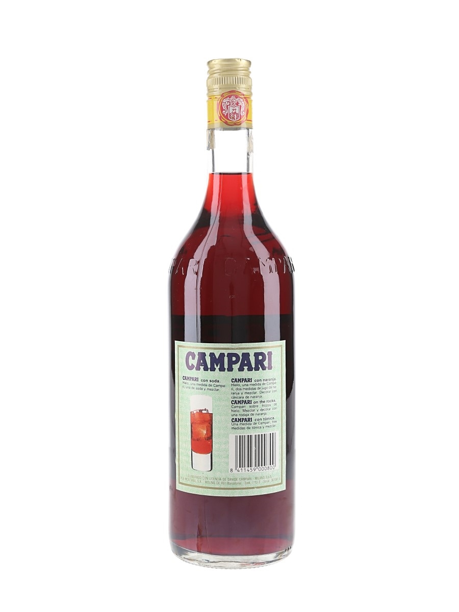 A bottle of Campari Bitter liqueur produced in Italy. We estimate this was bottled in the 1980s. Campari was invented in a Milan coffee shop by Gaspare Campari in 1860. It is a bitter liqueur flavoured with 68 herbs, fruits and spices.