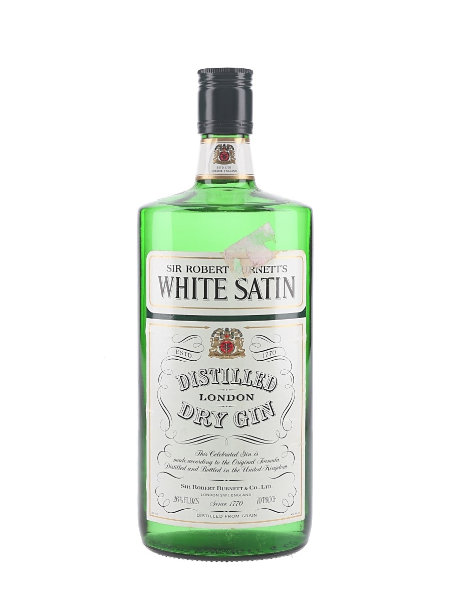 A bottle of Sir Robert Burnett's White Satin London Dry Gin. We estimate this was bottled in the 1970s.