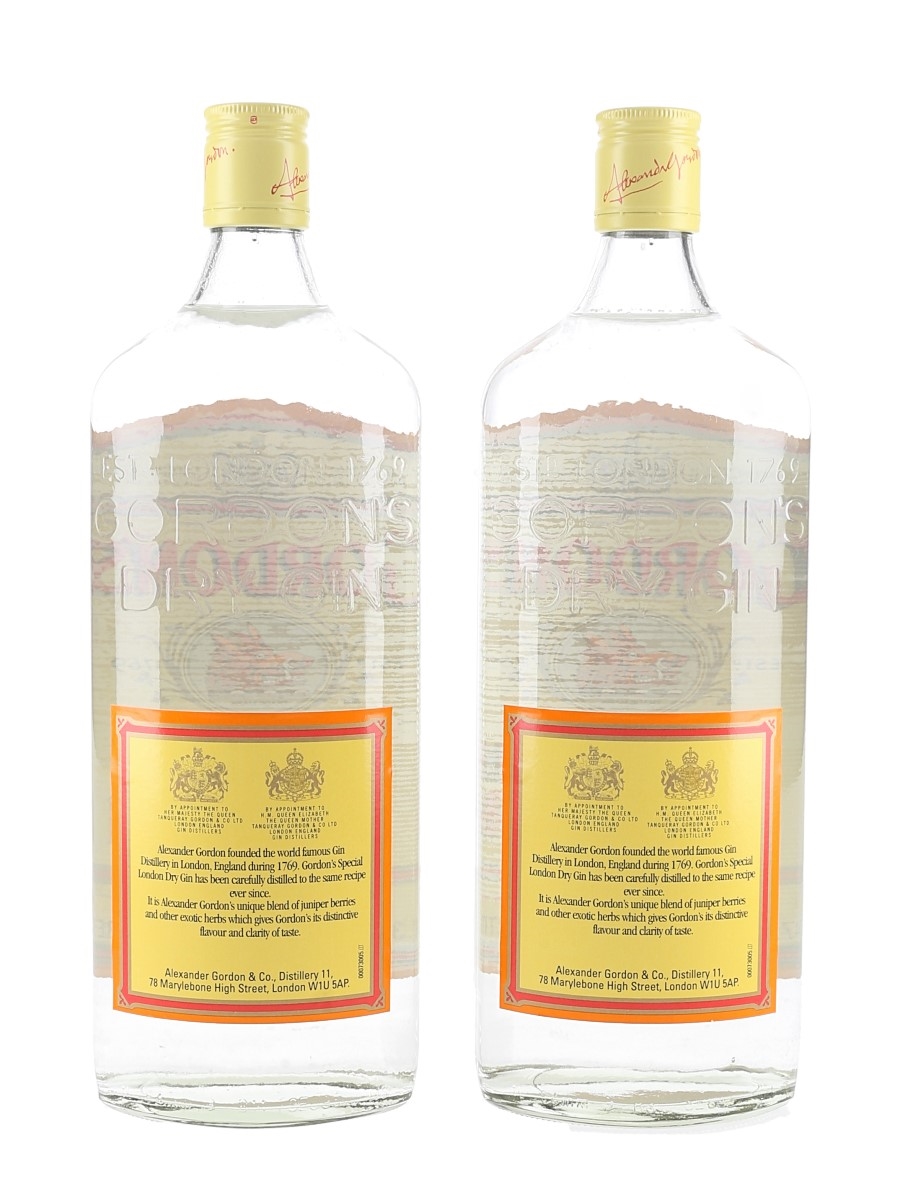 This lot contains two litre bottles of Gordon's Dry Gin, distilled and bottled in London by Alexander Gordon & Co. Ltd, in a twin pack. We estimate this was bottled in the 1990s.