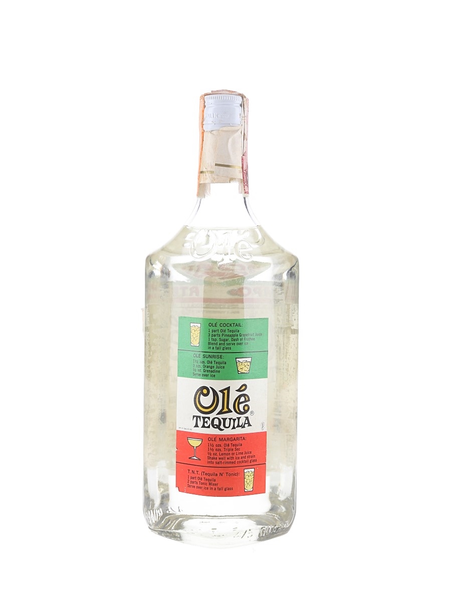A bottle of Olé Tequila produced and bottled in Mexico. This was bottled by Olé Products Company, Fresno, California, and Schenley, Pa and Imported to the Italian market by Stock in Trieste. We estimate this was bottled in the 1970s.