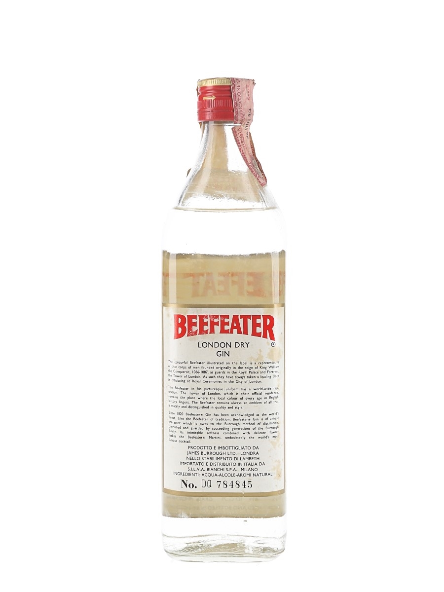 A bottle of Beefeater London Dry Gin, produced by James Burrough Limited. We estimate this was bottled in the early 1980s and imported to the Italian market by SILVA. This is bottle number DQ 784845.