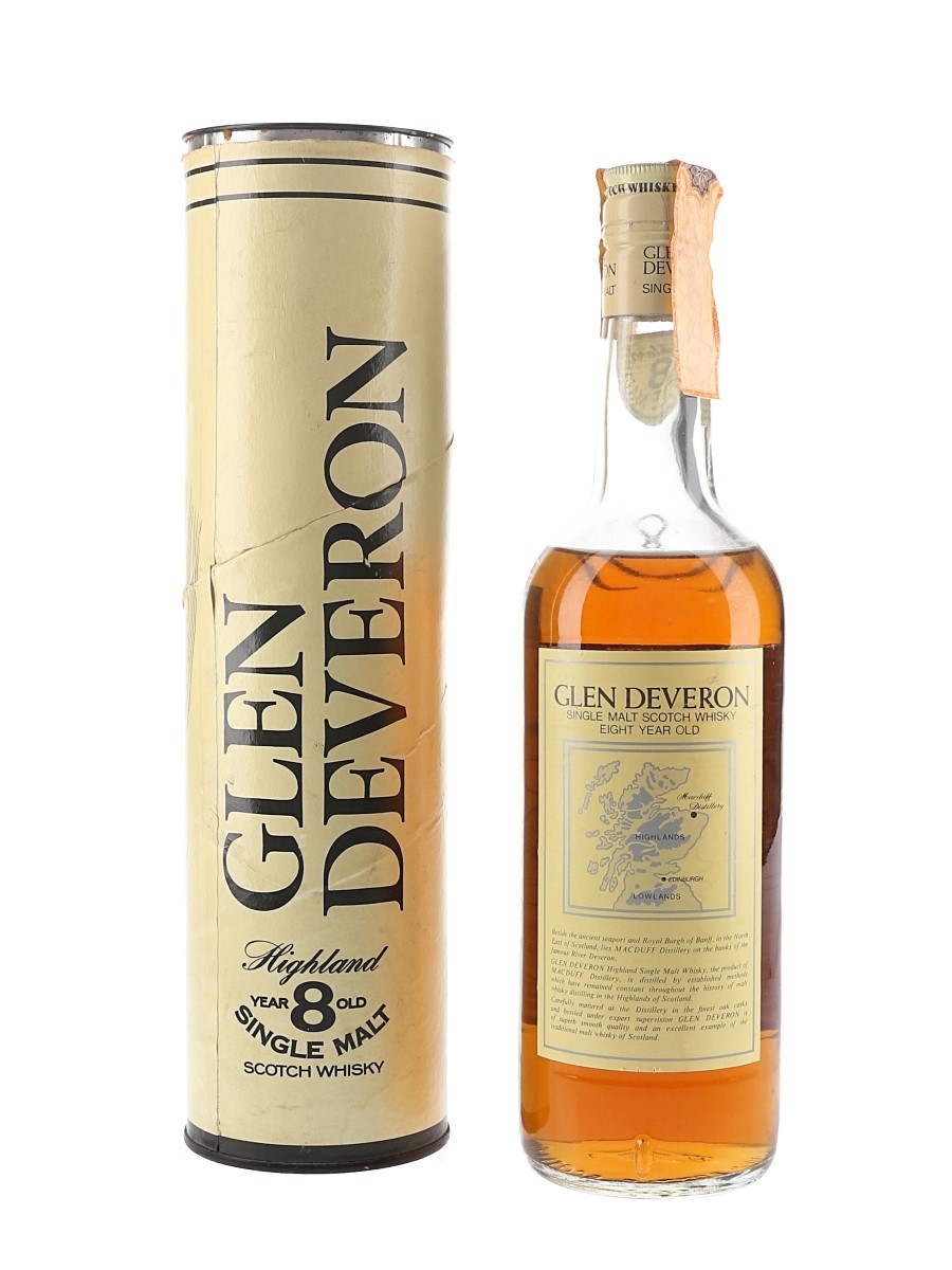 A bottle of Glen Deveron 8 Year Old Highland Single Malt Scotch Whisky produced at Macduff Distillery. We estimate this was bottled in the 1980s. This was imported for the Italian market by Martini and Rossi.