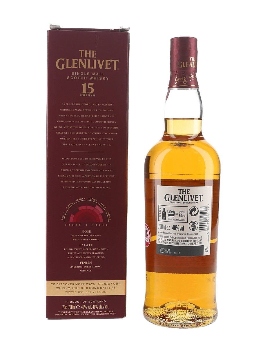 A bottle of The Glenlivet 15 Year Old The French Oak Reserve Single Malt Scotch Whisky, matured in Limousin oak casks.