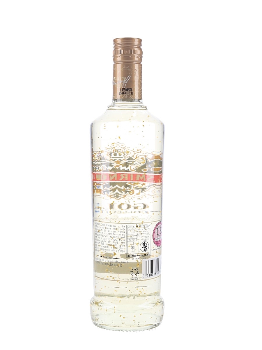 A bottle of Smirnoff Gold Collection, a cinnamon flavoured liqueur bottled with edible gold flakes. This was produced in Italy for The Smirnoff Co., London.