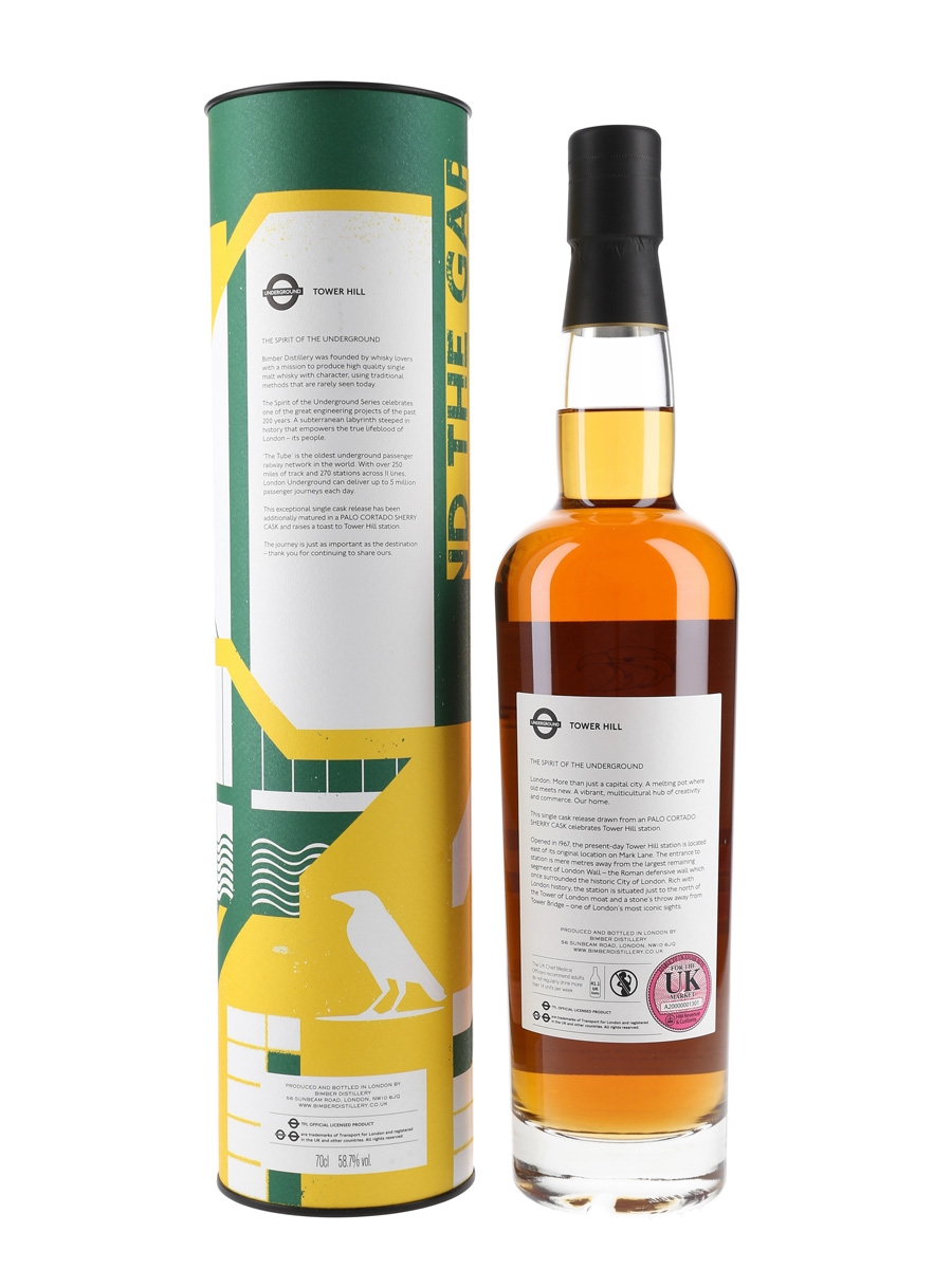 A bottle of Bimber Single Malt London Whisky, fully matured in a single Palo Cortado Sherry cask and bottled at cask strength in April 2022 as the Tower Hill edition in The Spirit of the Underground series.