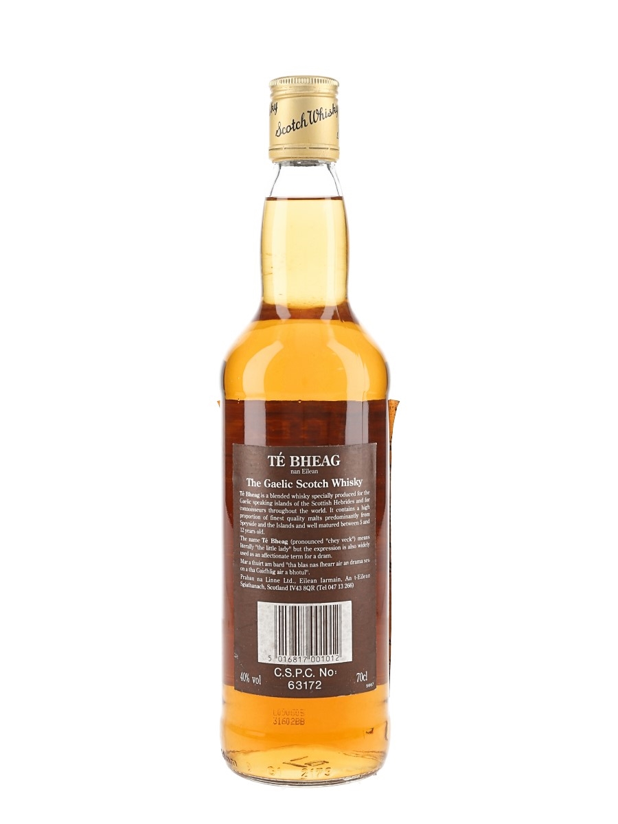 A bottle of Té Bheag Nan Eilean blended Scotch whisky, bottled by Praban Na Linne, a company set up in 1976 to provide whisky for the Gaelic speaking islands of Scotland. We estimate this was bottled in the 1990s.