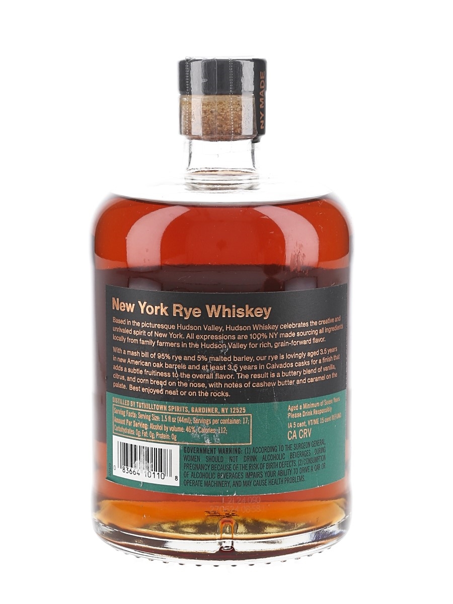 A bottle of Hudson 7 Year Old New York Rye Whiskey, finished in a calvados cask.