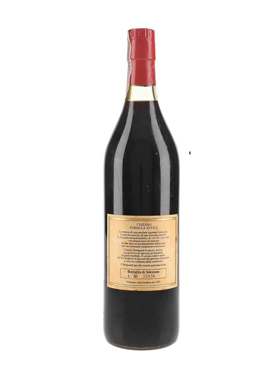 A litre bottle of Cinzano Antica Formula Vermouth. We estimate this was bottled in the 1970s.