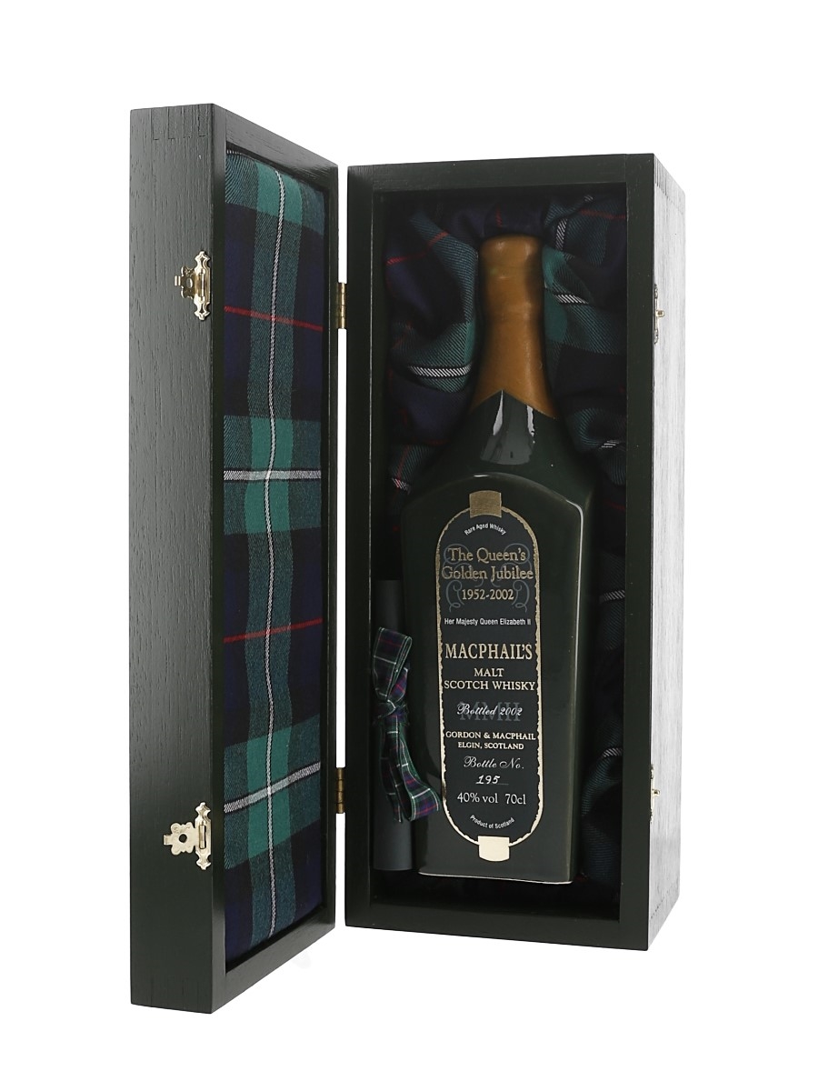 A bottle of MacPhail's Blended Malt Scotch whisky, released to celebrate Golden Jubilee of Queen Elizabeth II in 2002, presented in a commemorative wooden box.