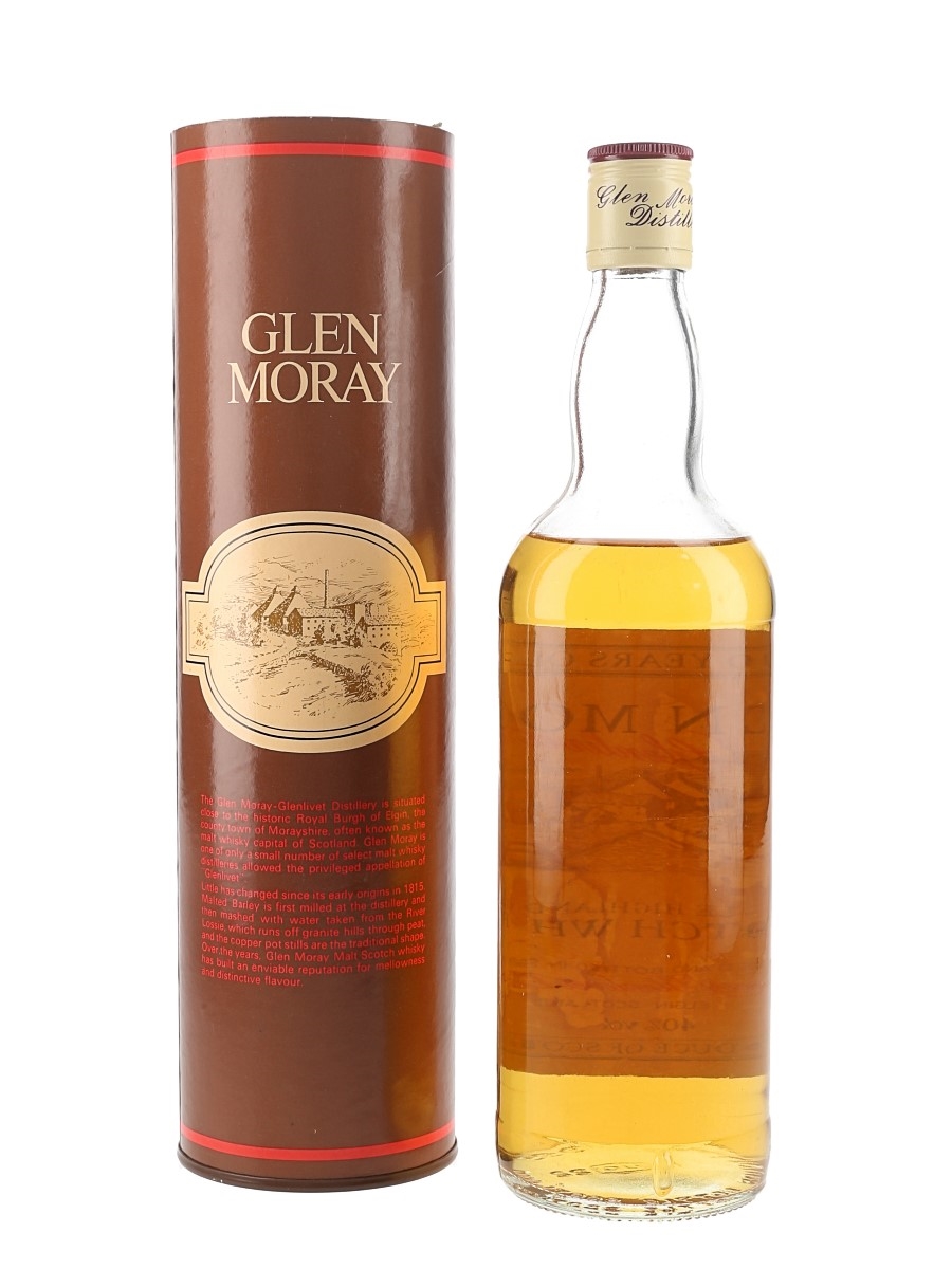 A bottle of Glen Moray Glenlivet 10 Year Old Single Highland Malt Scotch Whisky. We estimate that this was bottled in the 1980s.