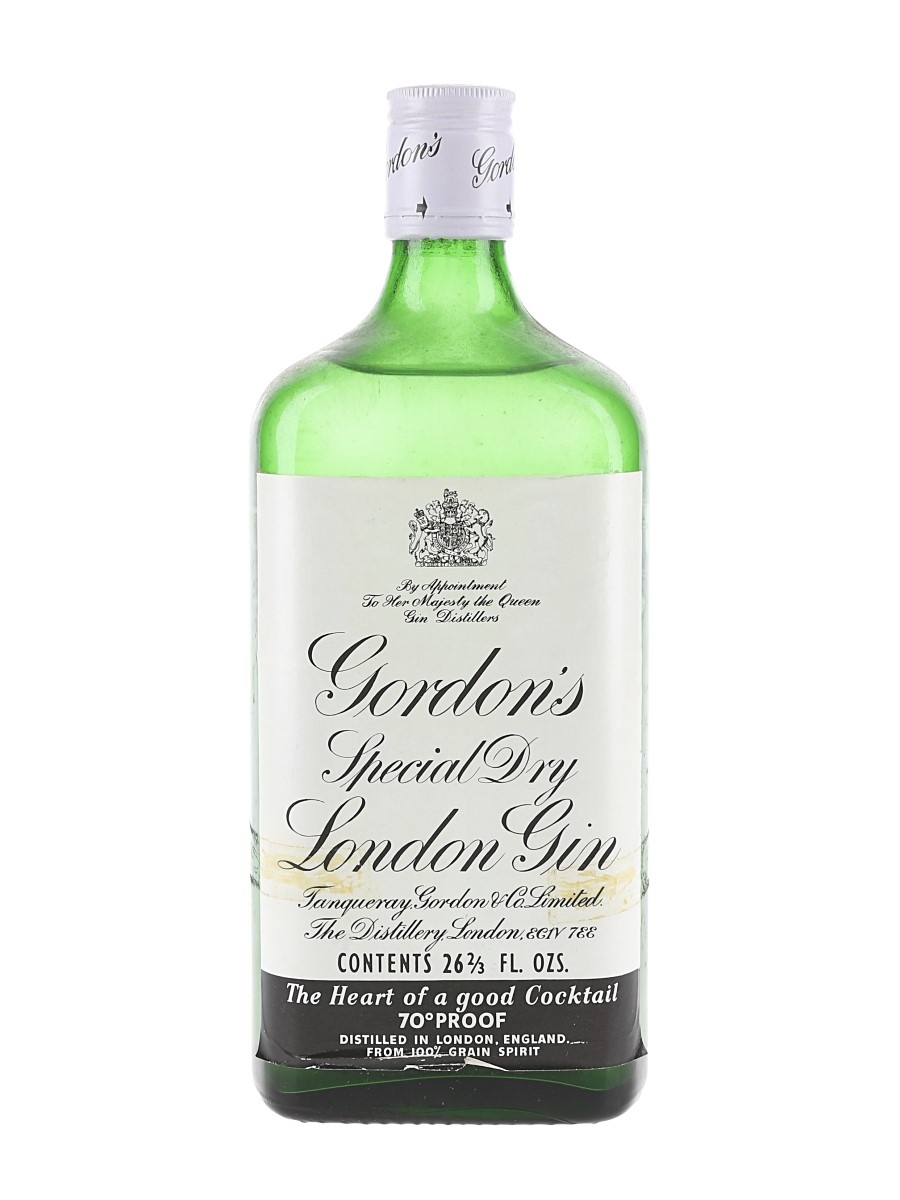 A bottle of Gordon's Special Dry London Gin, distilled and bottled by Tanqueray, Gordon & Co. Limited, The Distillery, London. We estimate this was bottled in the 1970s.