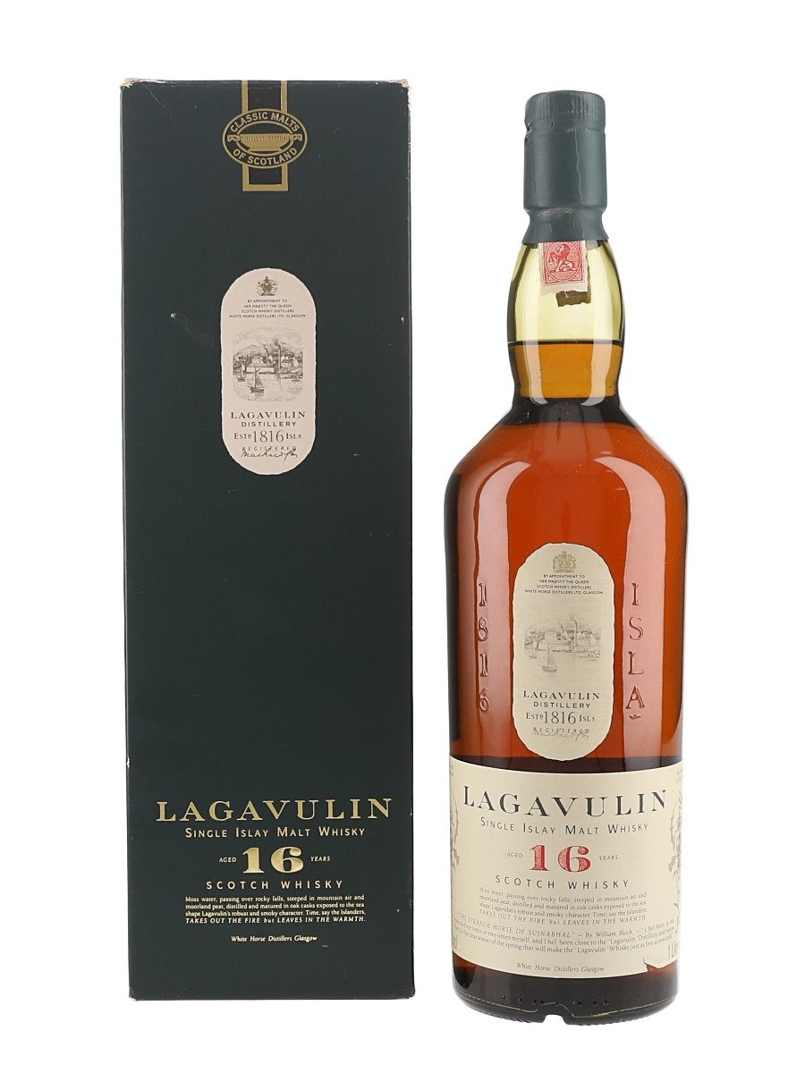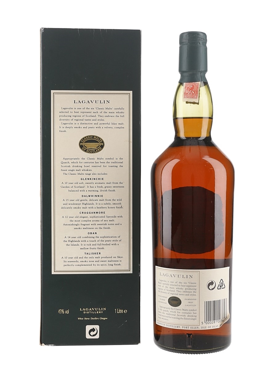 A litre bottle of Lagavulin 16 Year Old Single Islay Malt Scotch Whisky, part of Diageo's Classic Malts of Scotland range. We estimate this was bottled in the late 1990s, when the distillery was still owned by White Horse Distillers.