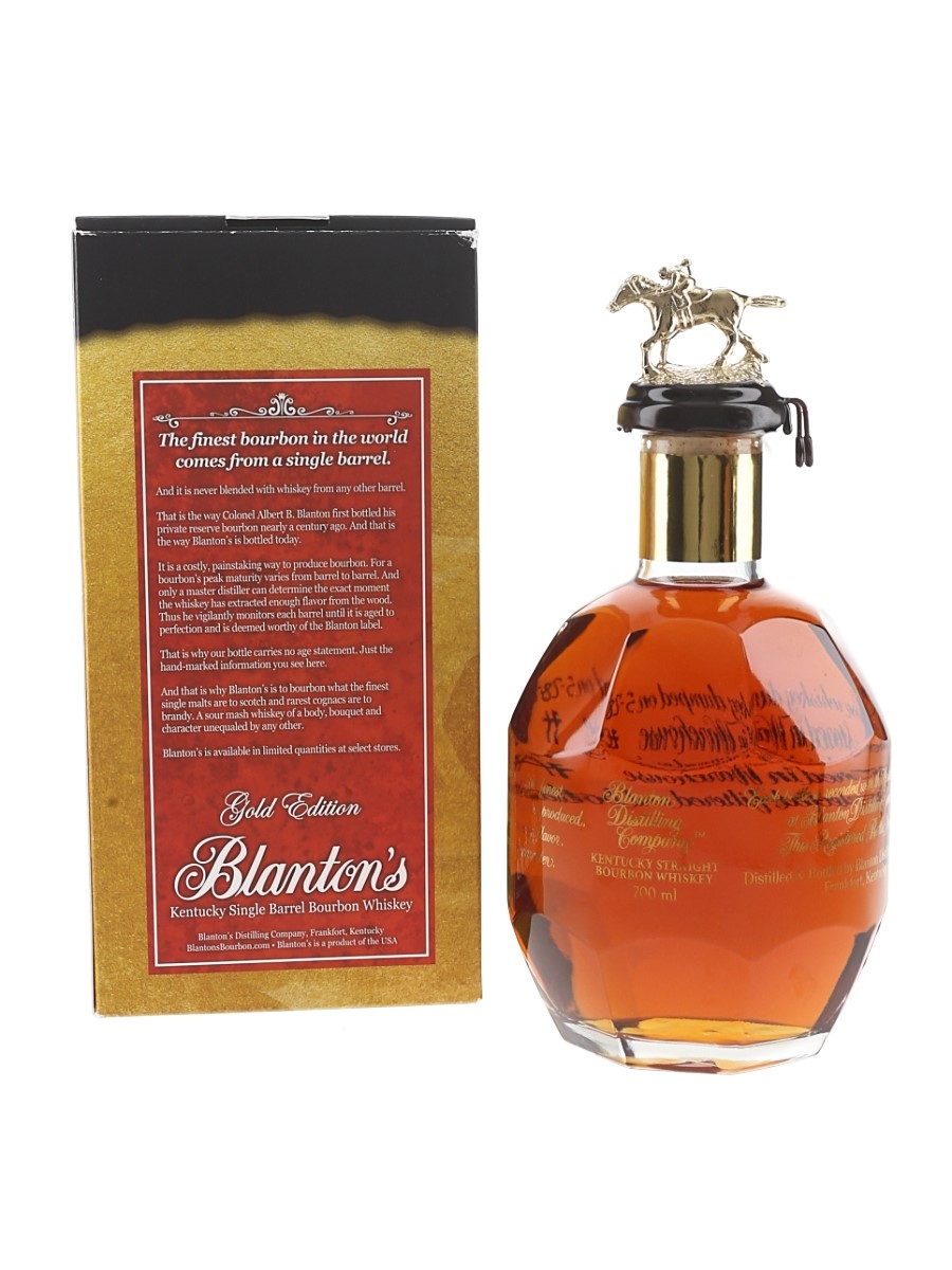 A bottle of Blanton's Gold Single Barrel Kentucky Straight Bourbon Whiskey.