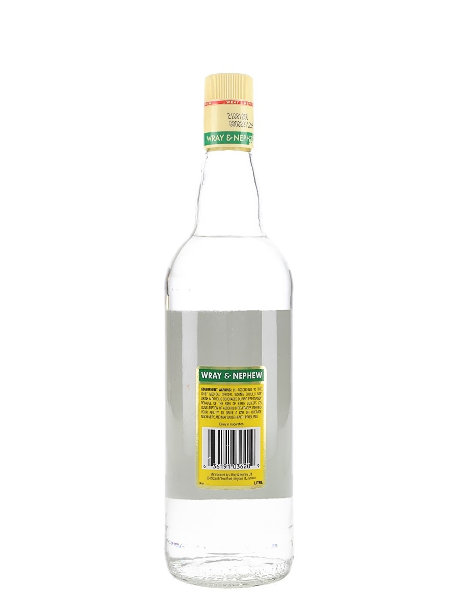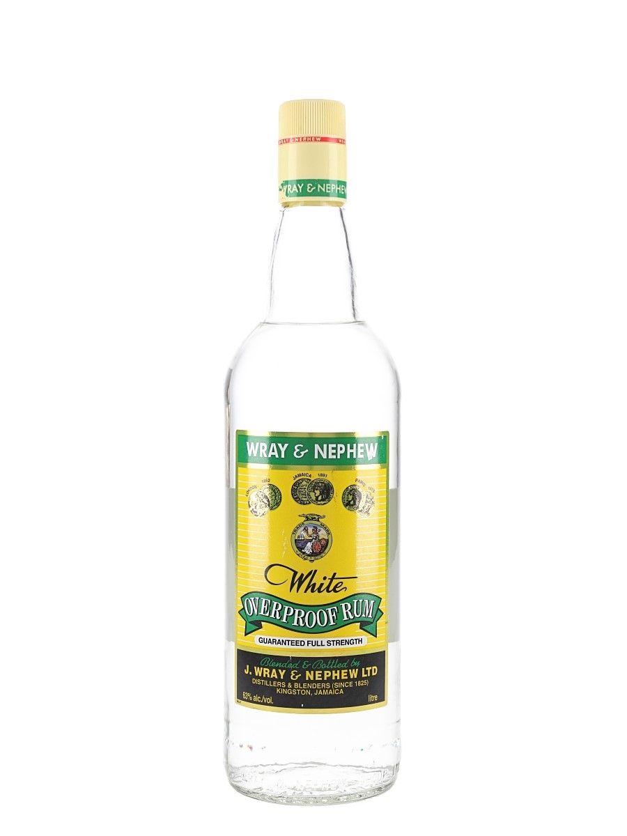 A litre bottle of Wray & Nephew White Overproof rum from Jamaica, bottled at 63% ABV.