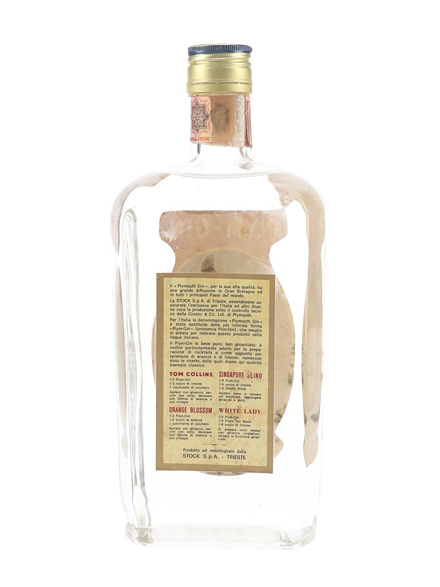 A bottle of Plym-Gin, a dry Plymouth gin. This was produced in Italy by Stock, under licence from and control of Coates & Co. We estimate this was bottled in the 1970s.