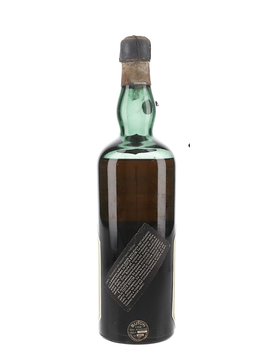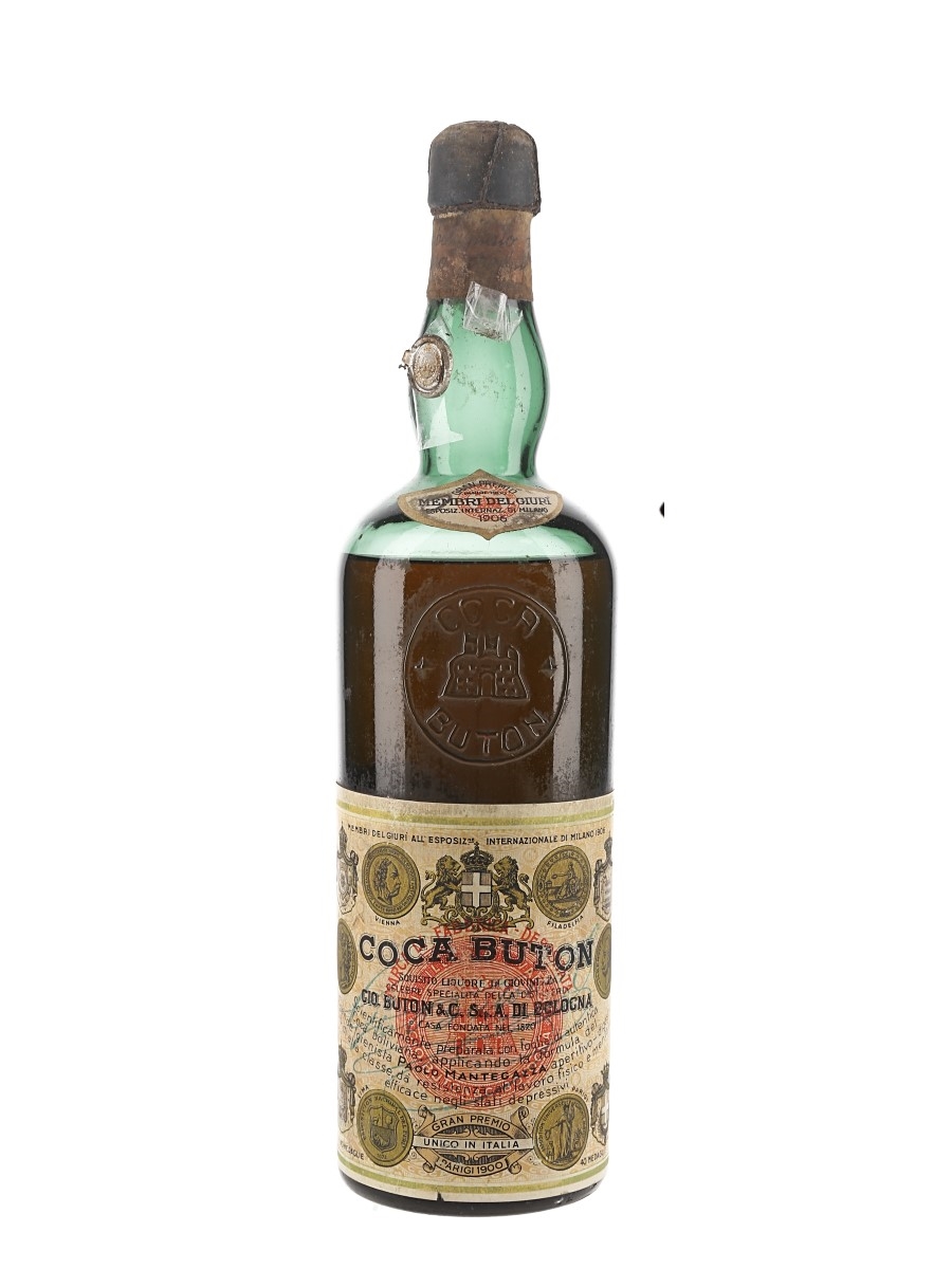 A bottle of Coca Buton, an Italian liqueur made from alcohol infused with coca leaves and other aromatic herbs. We estimate this was bottled in the 1950s.