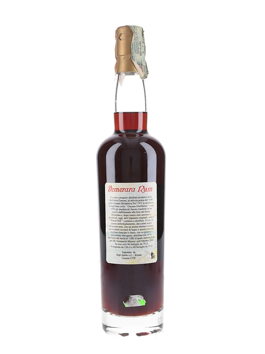 A bottle of Demerara rum from Guyana. This was distilled in 1974 and bottled in 2004. This was distributed in Italy by High Spirit.