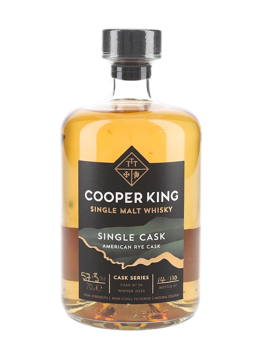 A bottle of Cooper King Single Malt Whisky. This was matured in a single American rye cask, number 34, and bottled at 57.3% ABV in Winter 2024. This is bottle number 14 of 110.