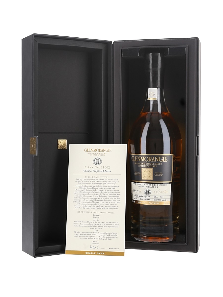 A bottle of Glenmorangie 23 Year Old Highland Single Malt Scotch Whisky. This was hand selected by Dr Bill Lumsden for MH Private UK, matured in a second fill hogshead before bottling on the 20 October 2022.
