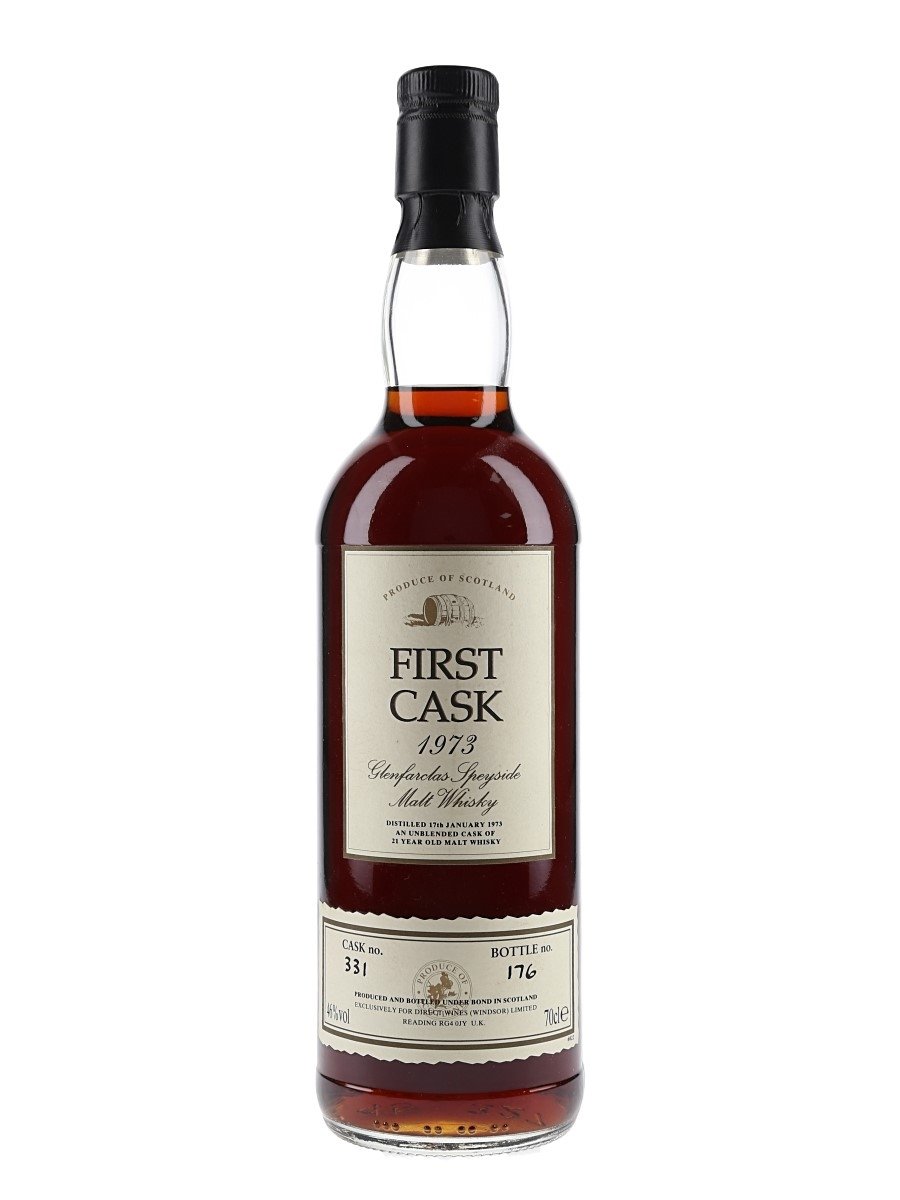 A bottle of Glenfarclas 21 Year Old Speyside Malt Whisky. This was distilled on 17 January 1973, matured for 21 years and bottled at 46% ABV by Direct Wines Limited for their First Cask series and was available exclusively to First Cask Circle Members.
