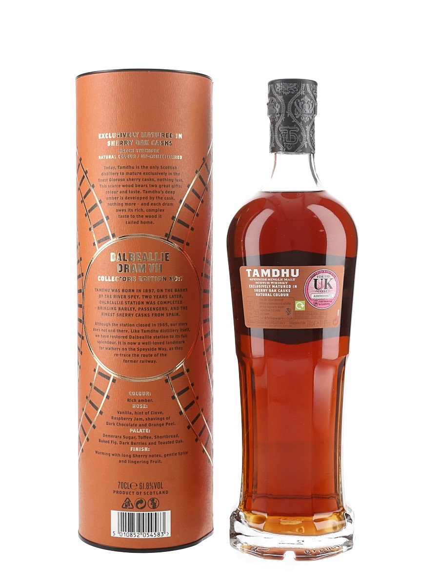 A bottle of Tamdhu Dalbeallie Dram No. 7 Speyside Single Malt Scotch Whisky. This whisky is named In honour of Dalbeallie Station which was built two years after Tamdhu was established in 1897 and brought barley, passengers and sherry casks to the distillery.