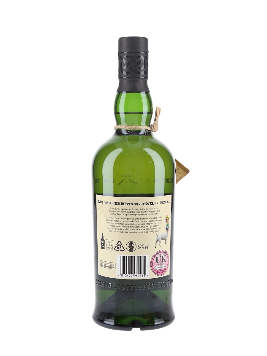 A bottle of Ardbeg Drum Islay Single Malt Scotch Whisky, the Ardbeg Committee Only Edition of 2019. This was matured in ex-bourbon casks and finished in rum casks.