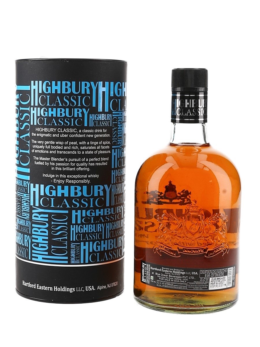 A bottle of Highbury Classic Superior Grain Whisky. Blended and bottled for Hartford Eastern Holdings, USA by Blue Ocean Beverages Ltd, India.