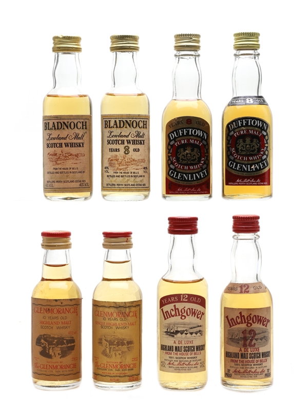 Single Malt Scotch Whisky Miniatures Glenmorangie, Dufftown, Bladnoch, Inchgower 8 x 5cl / 40%