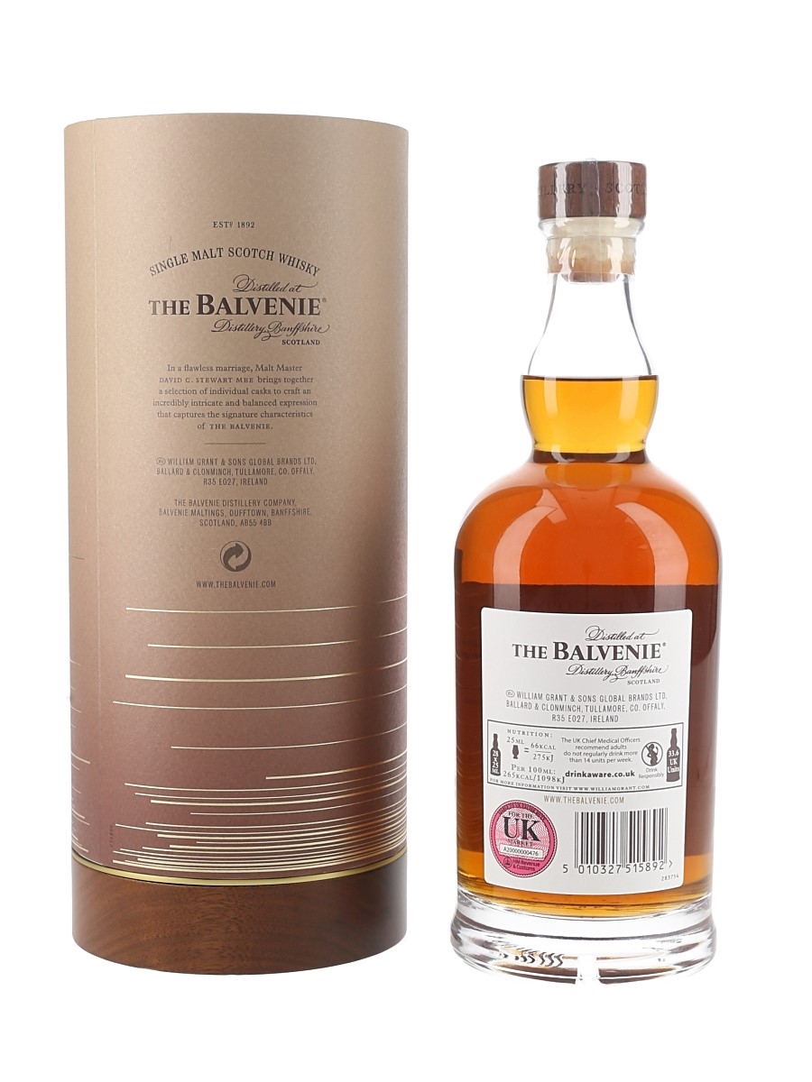 A bottle of The Balvenie 25 Year Old Single Malt Scotch Whisky from Balvenie's Rare Marriages series, matured in a combination of European and American oak casks.