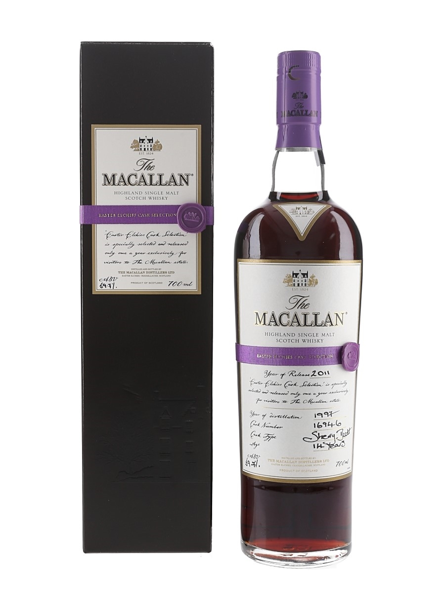 A bottle of The Macallan 14 Year Old Single Malt Scotch Whisky. This was distilled in 1997, matured in a sherry butt and released in 2011 as part of the Easter Elchies Cask Selection.