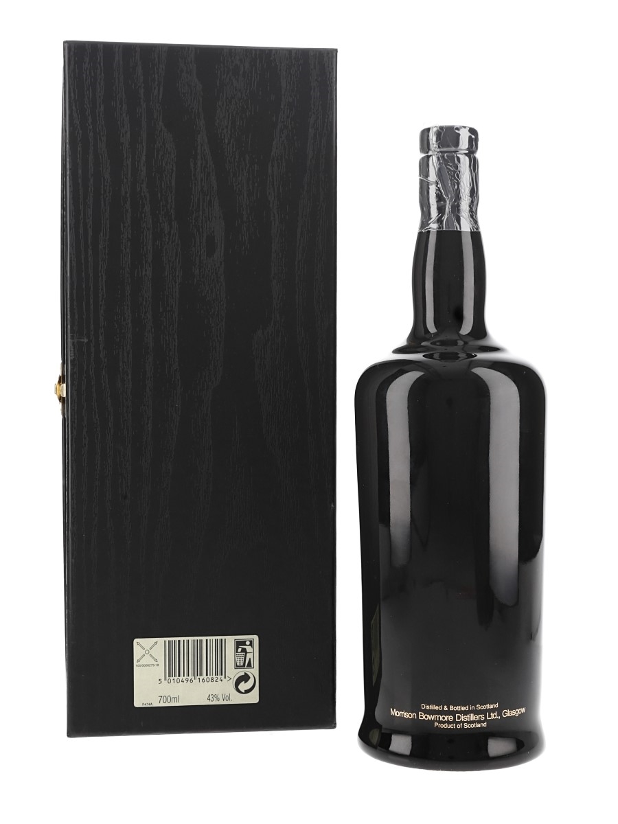 A bottle of Bowmore 30 Year Old Islay Single Malt Scotch Whisky presented in a black ceramic decanter.