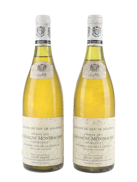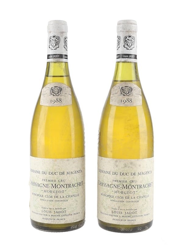 This lot contains two bottles of 1988 Chassagne Montrachet Morgeot Clos de la Chapelle Duc de Magenta produced by Louis Jadot.