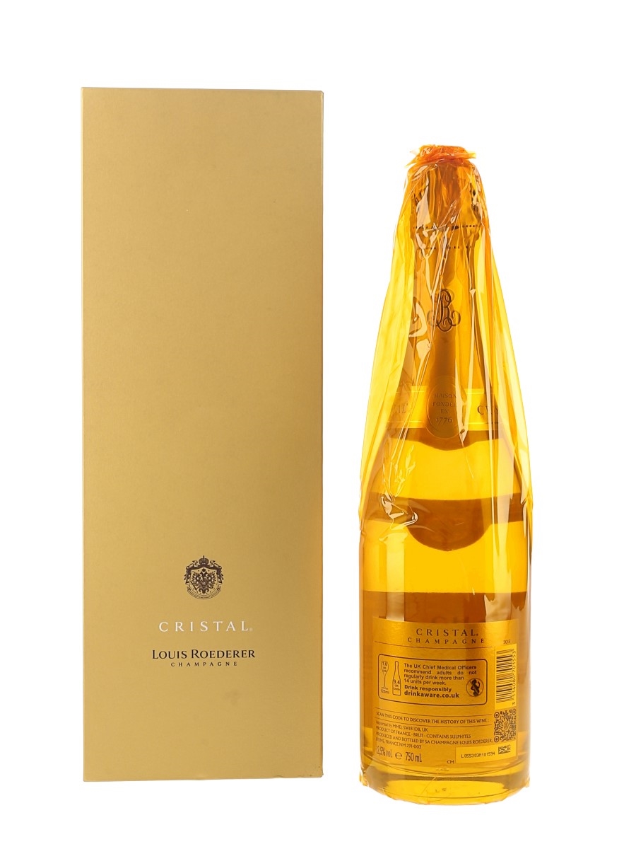A bottle of Louis Roederer Cristal from the 2015 vintage. A blend of 60% Pinot Noir and 40% Chardonnay.