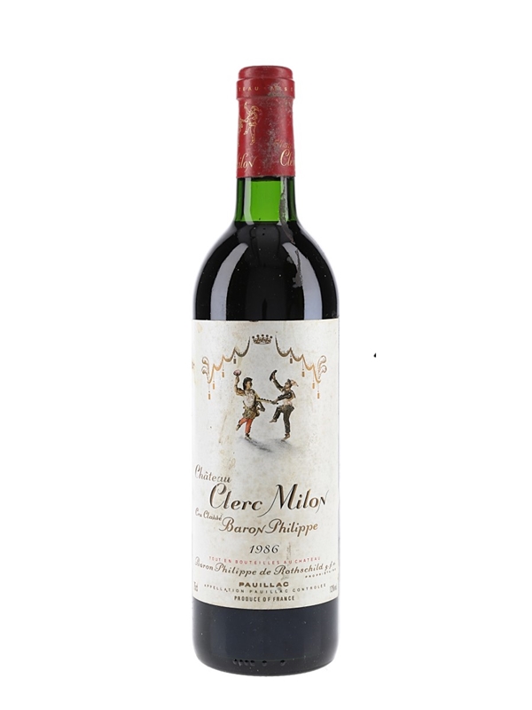 A bottle of 1986 Château Clerc Milon Grand Cru Classé from the Pauillac appellation in Bordeaux, a 'fifth growth' in the 1855 Bordeaux Classification.