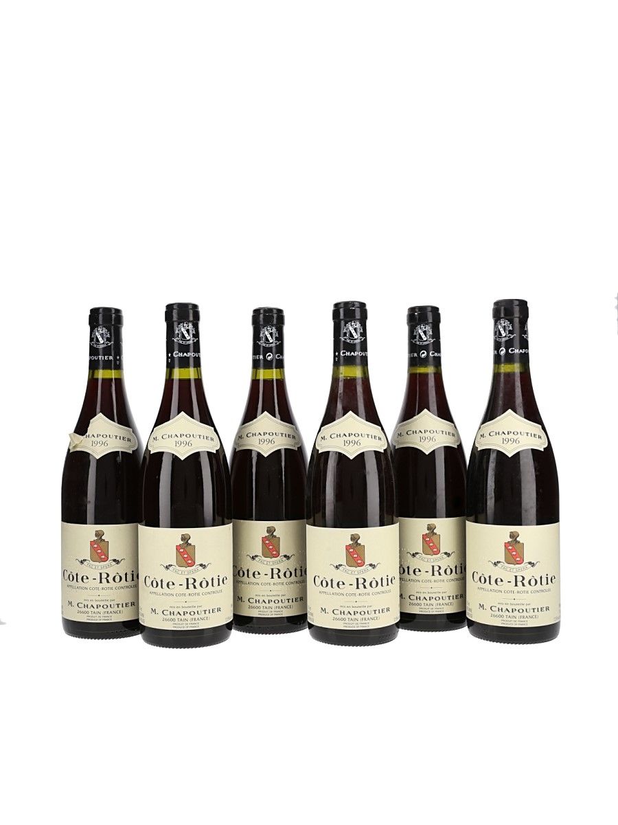 This lot contains six bottles of 1996 Côte Rôtie ptoduced by M. Chapoutier.