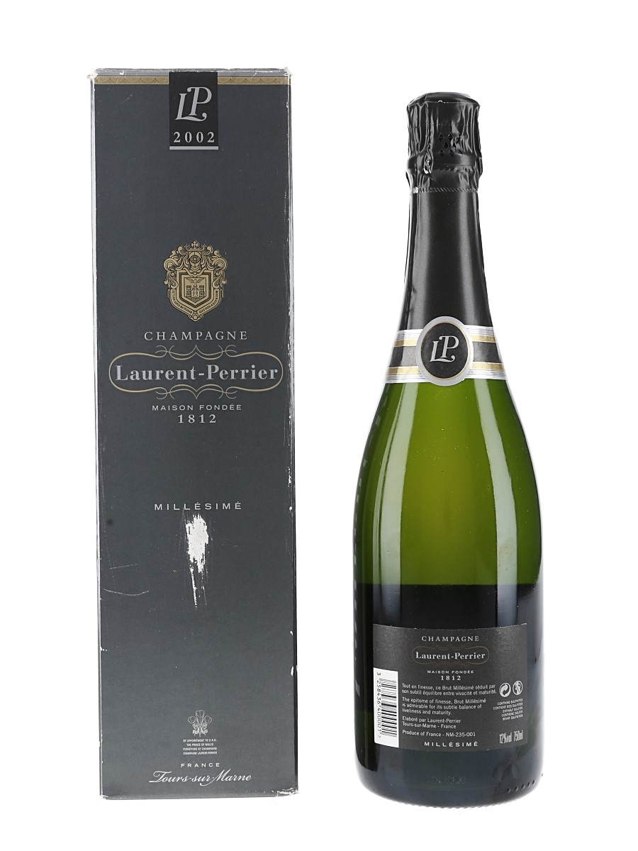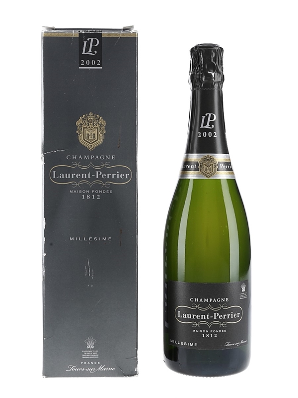 A bottle of Laurent Perrier Brut Millésimé 2002 Champagne, a blend of 50% Chardonnay and 50% Pinot Noir.
