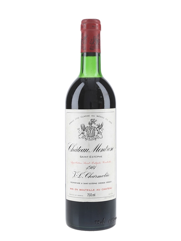 A bottle of 1981 Château Montrose L Charmolüe, a second growth in the 1855 Classification from the Saint-Estèphe appellation in Bordeaux. The vineyards are planted with 65% Cabernet Sauvignon, 25% Merlot and 8% Cabernet Franc and 2% Petit Verdot, with the vines planted in a single solid block on gravel and iron-rich soil.
