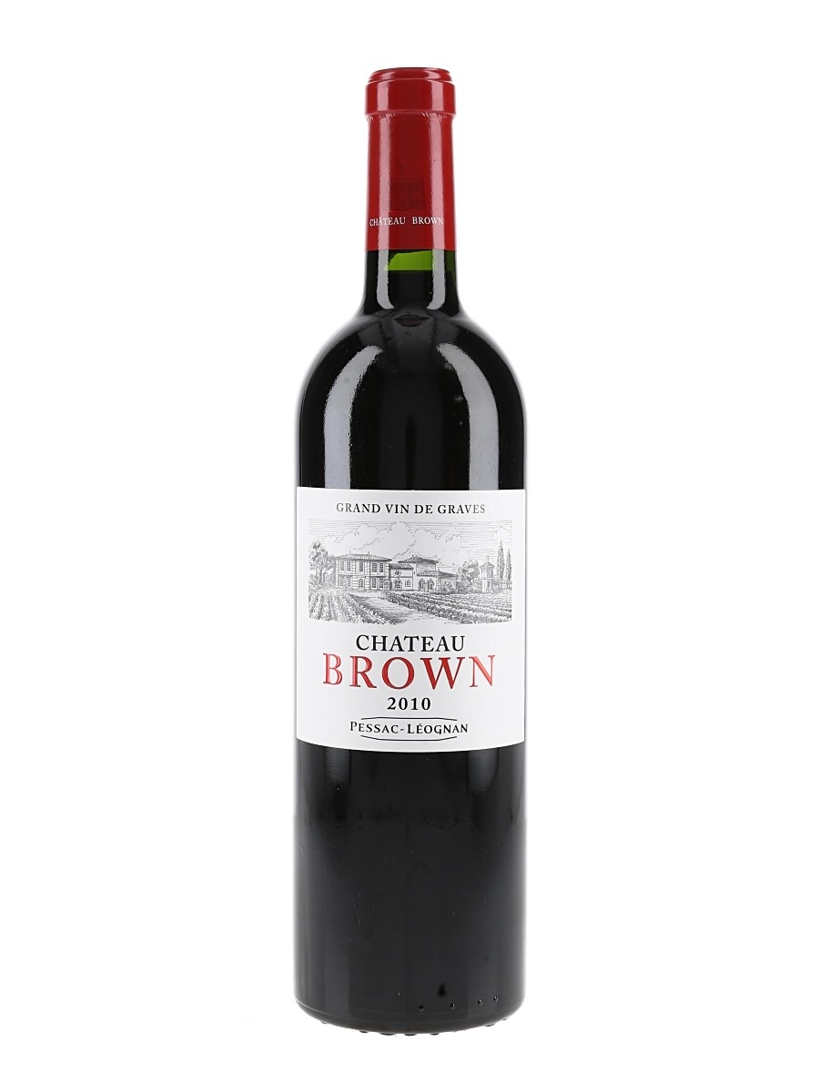 A bottle of 2010 Château Brown from the Pessac-Leognan appellation in Bordeaux.