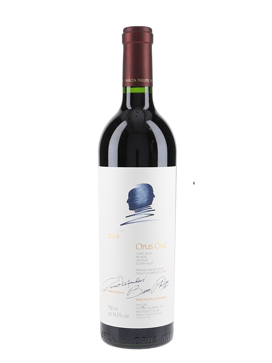 A bottle of 2018 Opus One, a red wine from Napa Valley, California, produced and bottled by Robert Mondavi and Baron Philippe de Rothschild.