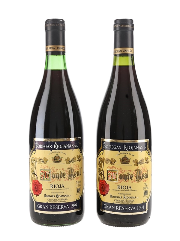 This lot contains two bottles of 1994 Monte Real Gran Reserva Rioja, bottled by Bodegas Riojanas.