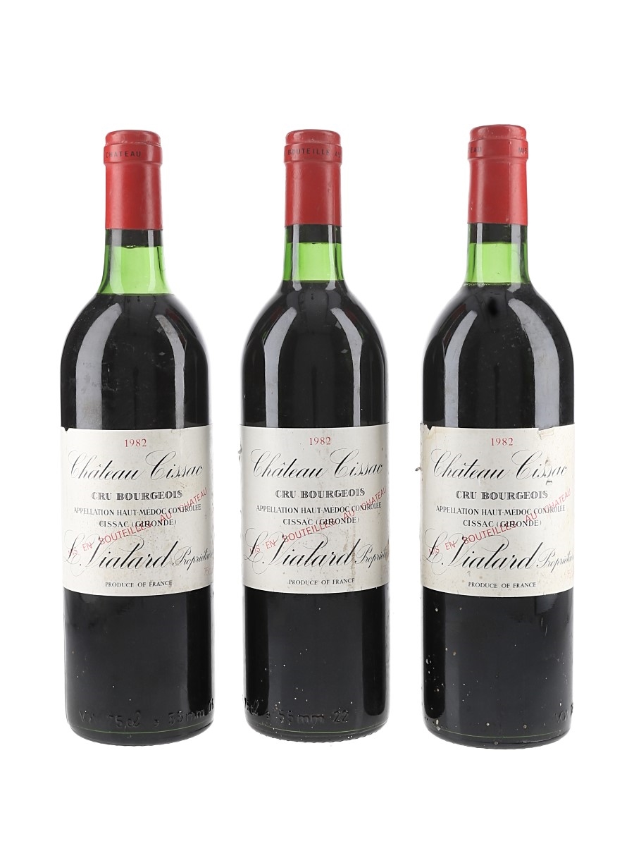 This lot contains three bottles of 1982 Château Cissac, a 50 hectare estate Cru Bourgeois property in the Haut-Médoc appellation in Bordeaux. It is planted with 70% Cabernet Sauvignon, 25% Merlot and 5% Petit Verdot.