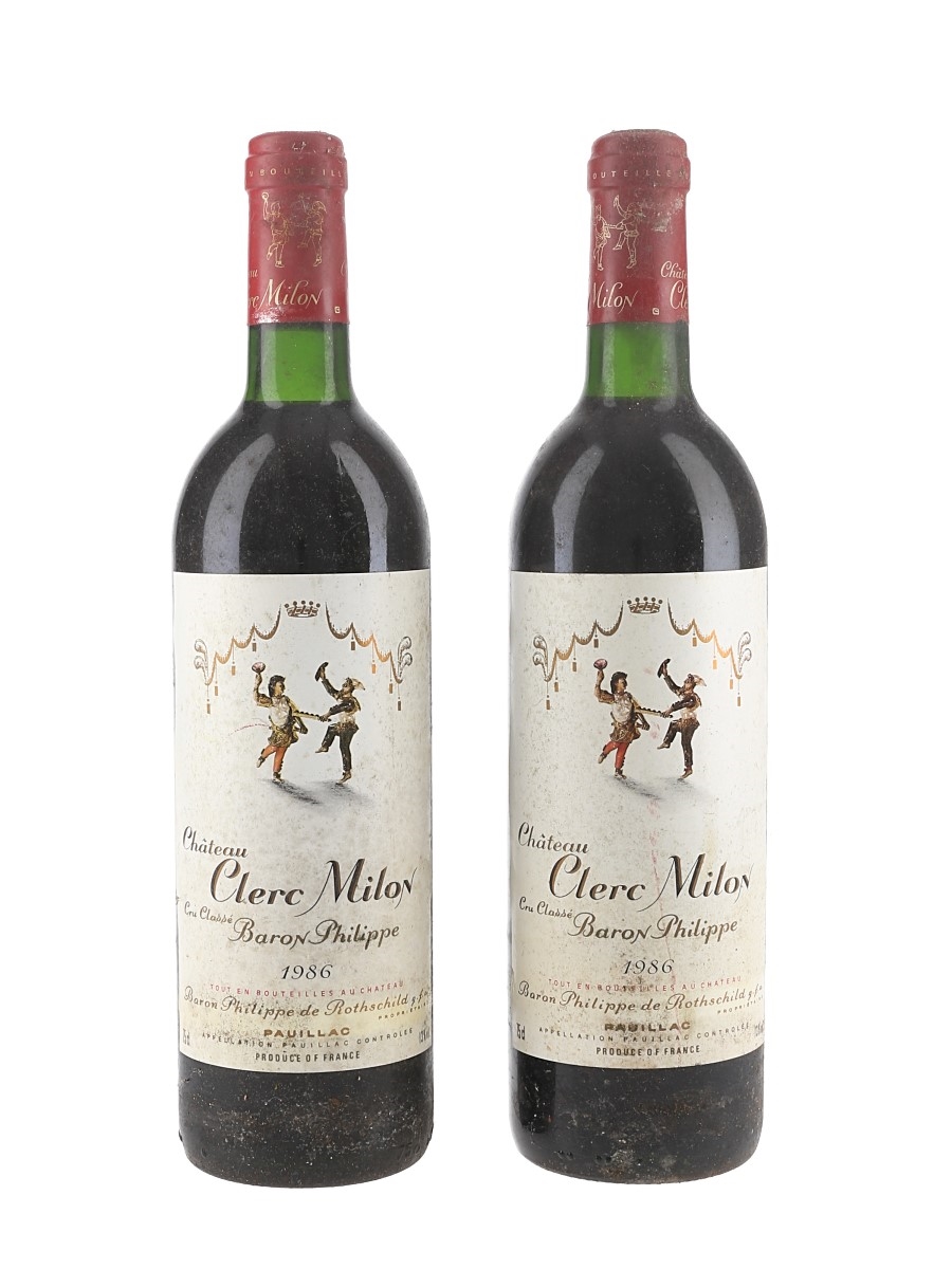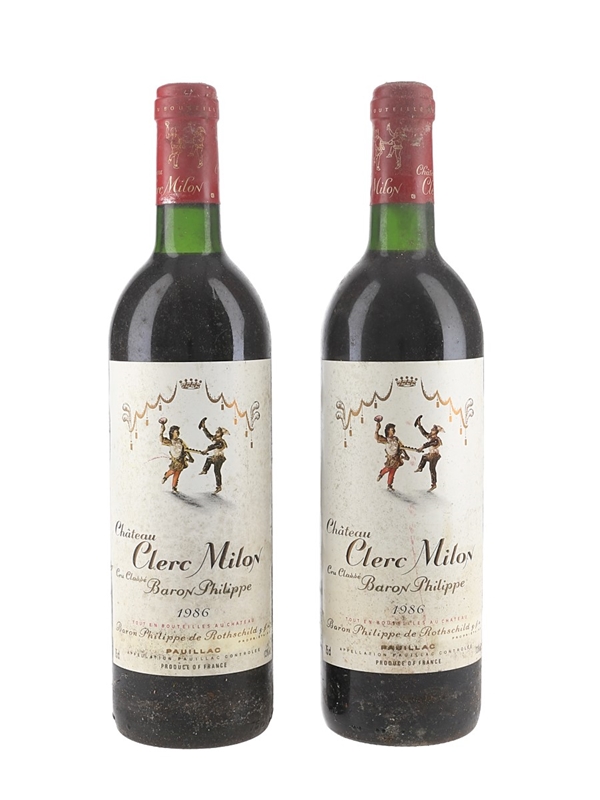 This lot contains two bottles of 1986 Château Clerc Milon Grand Cru Classé from the Pauillac appellation in Bordeaux, a 'fifth growth' in the 1855 Bordeaux Classification.