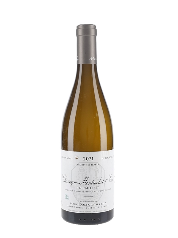 A bottle of 2021 Chassagne-Montrachet 1er Cru En Cailleret from Marc Colin.
