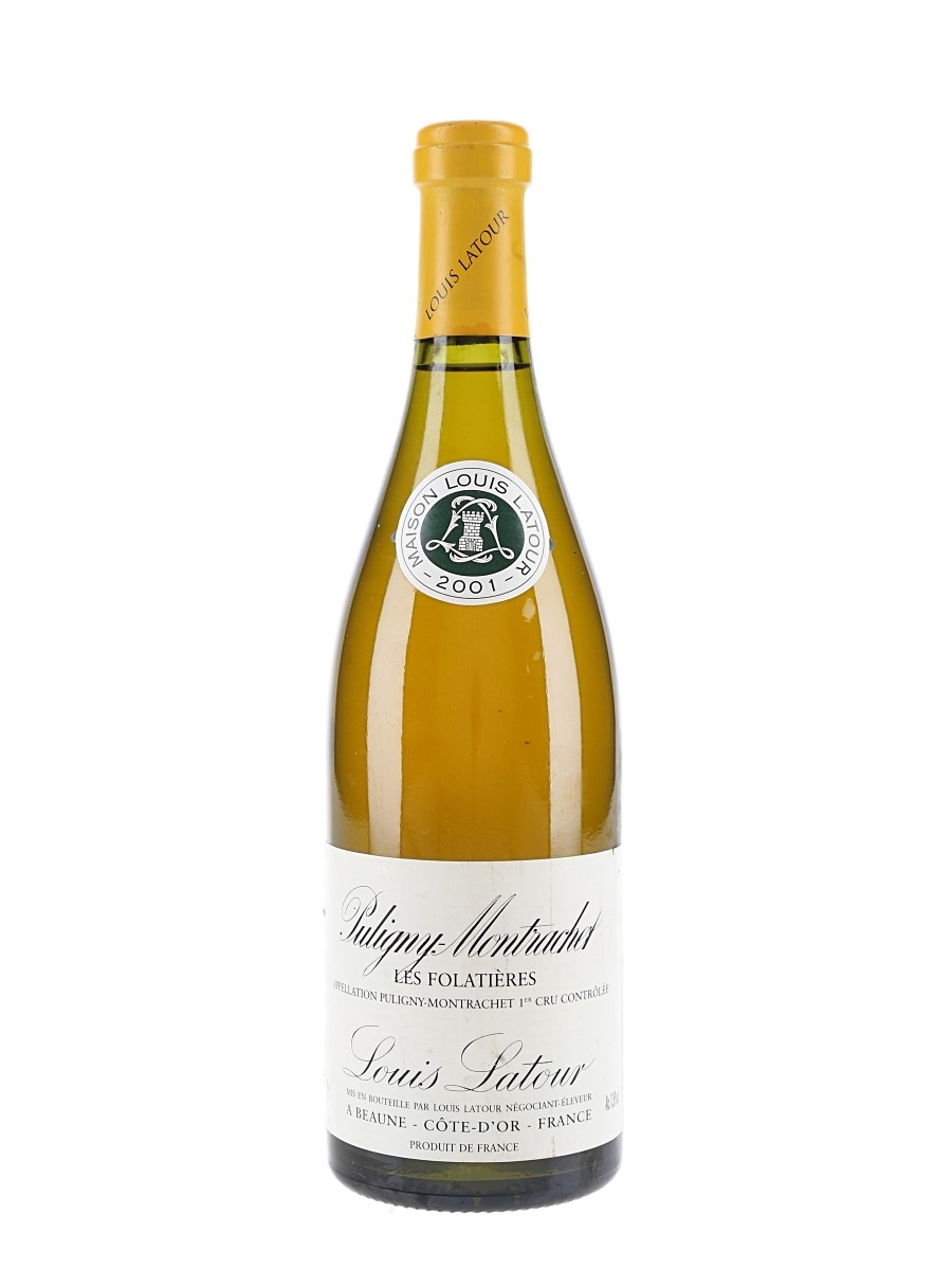 A bottle of 2001 Puligny Montrachet Les Folatières Premier Cru bottled by Louis Latour. Les Folatières is a well-regarded premier cru vineyard in the Puligny-Montrachet appellation of the Côte de Beaune subregion of Burgundy's Côte d'Or.