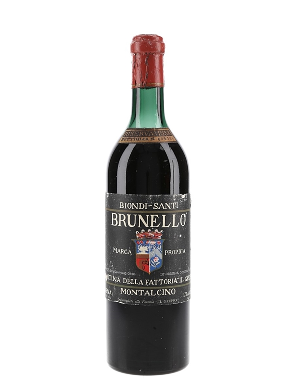 A 72cl bottle of 1958 Brunello di Montalcino Riserva produced in Italy at Cantina Della Fattoria 'Il Greppo'.