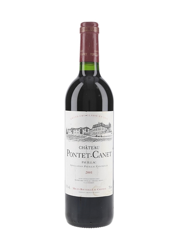 A bottle of 2001 Château Pontet-Canet, an 81-hectare Grand Cru Classé estate located in the Pauillac appellation, just south of Châteaux Mouton Rothschild and d’Armailhac.