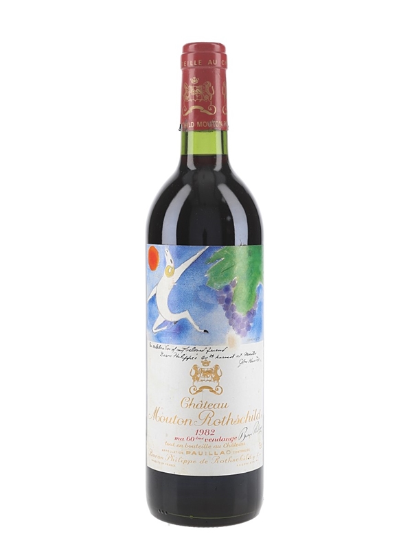 A bottle of Chateau Mouton Rothschild 1982 from Bordeaux's Pauillac appellation, featuring a label by John Huston (1906-1987). This was released to celebrate Baron Philippe's 60th harvest.