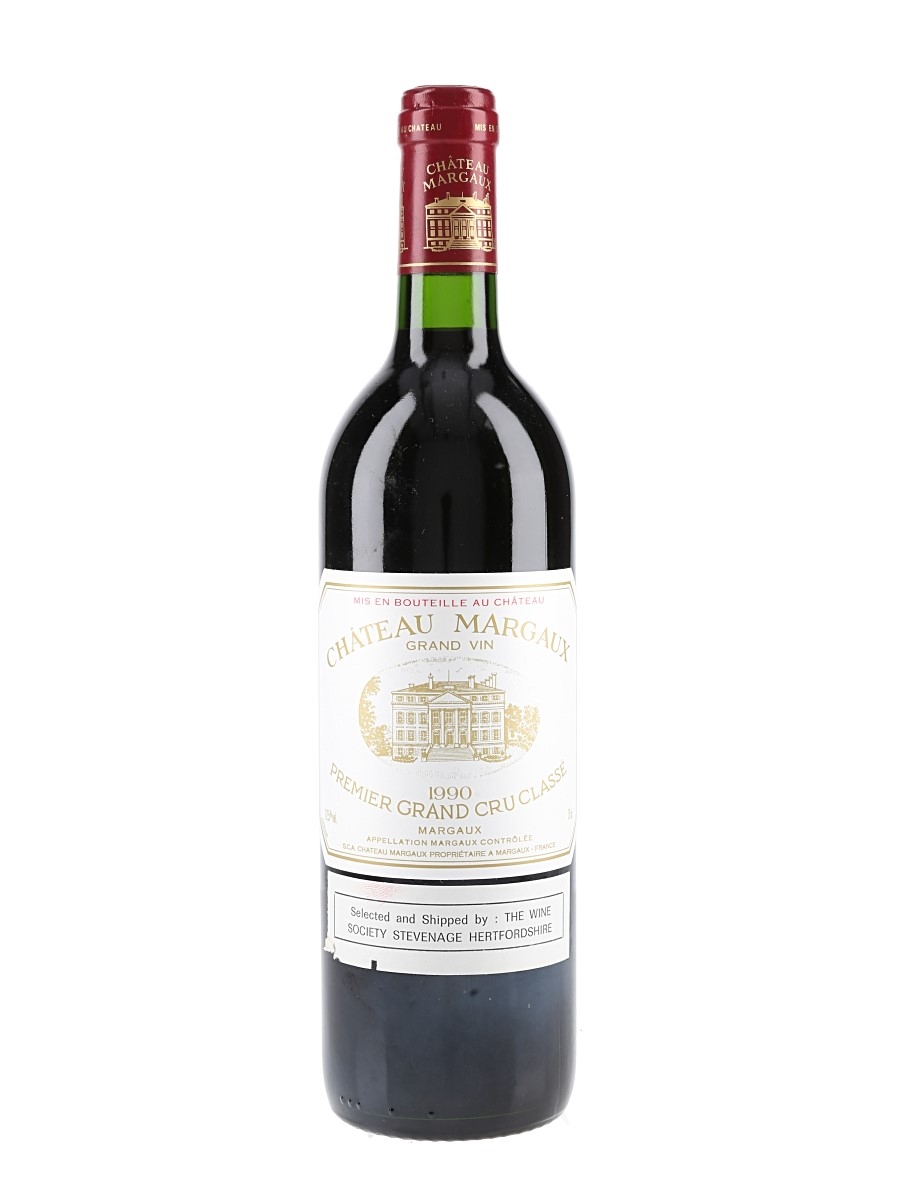 A bottle of 1990 Château Margaux Premier Grand Cru Classé, imported to the UK by The Wine Society.