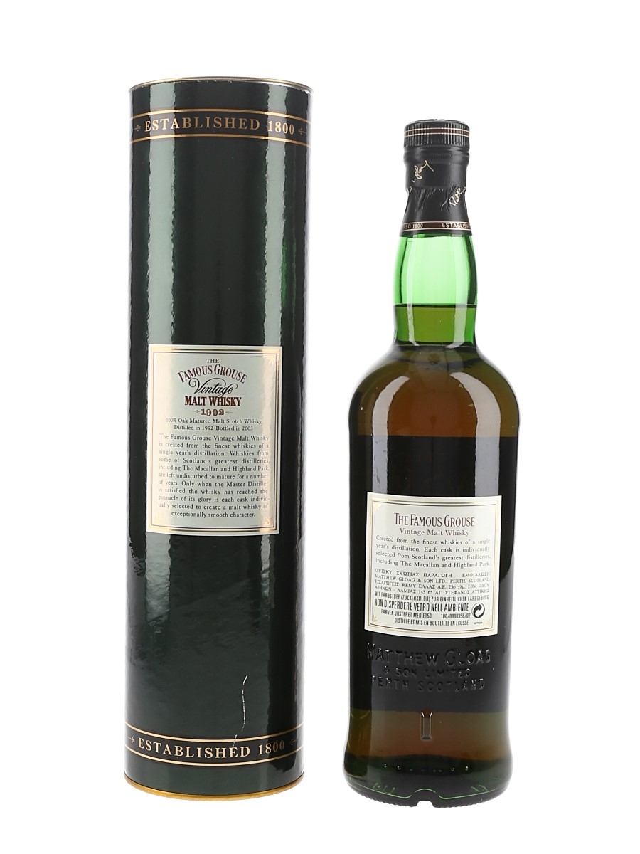 A bottle of The Famous Grouse Vintage Malt Whisky produced by Matthew Gloag & Sons Limited. This was distilled in 1992 and bottled in 2003. This whisky include malts from Highland Park and The Macallan.
