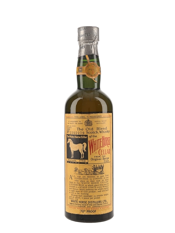 A bottle of White Horse The Old Blend Scotch Whisky bottled in 1957. This is bottle number 2282279.